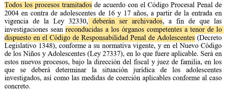 La Ley 32330, publicada el 10 de mayo de 2025, modificó el Código Penal y el Código de Responsabilidad Penal de Adolescentes para hacer imputables como adultos a adolescentes de 16 y 17 años, pero únicamente cuando hubieran cometido delitos de una lista cerrada de conductas graves.
